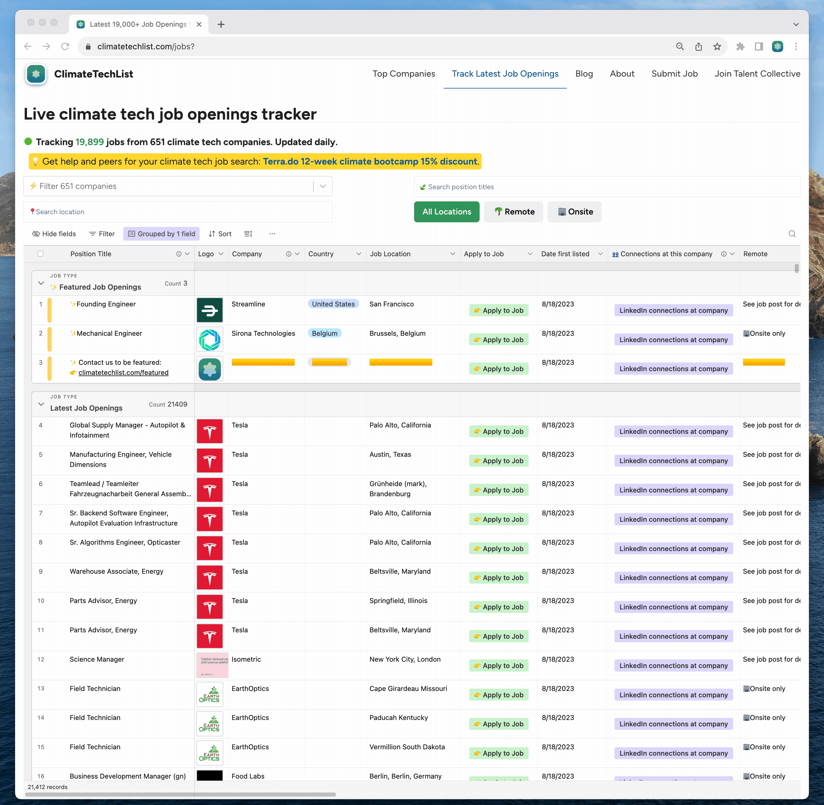 job tracker- aggregating 30,000+ jobs postings from 1000+ climate tech company job boards, updated daily